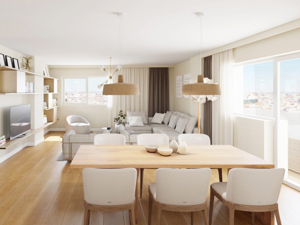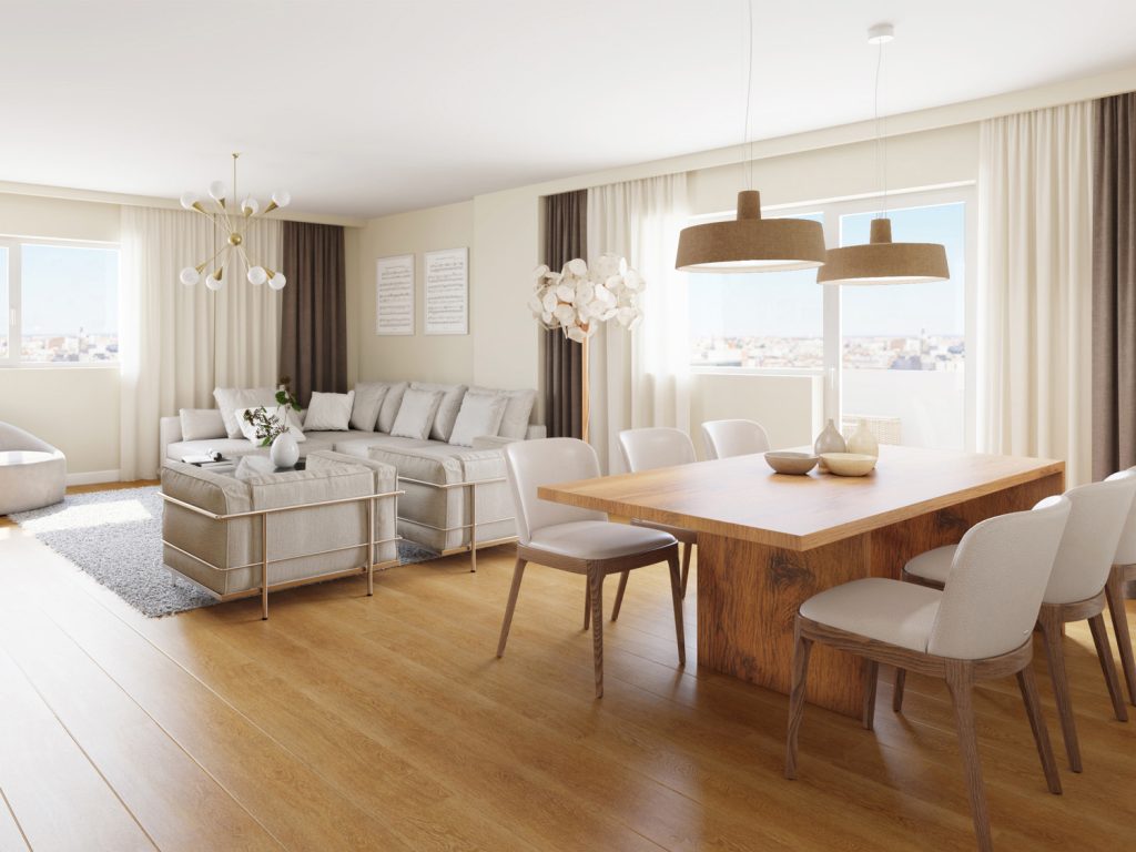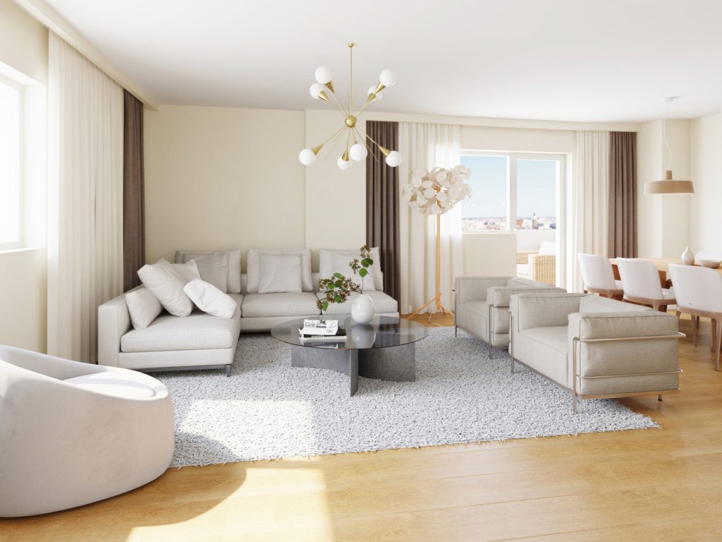Se planea la reforma integral de un piso y como herramienta de venta modelamos, texturizamos e iluminamos la vivienda de acuerdo a los materiales y colores previstos, con una propuesta de amueblamiento apoyada por los arquitectos autores de la reforma.